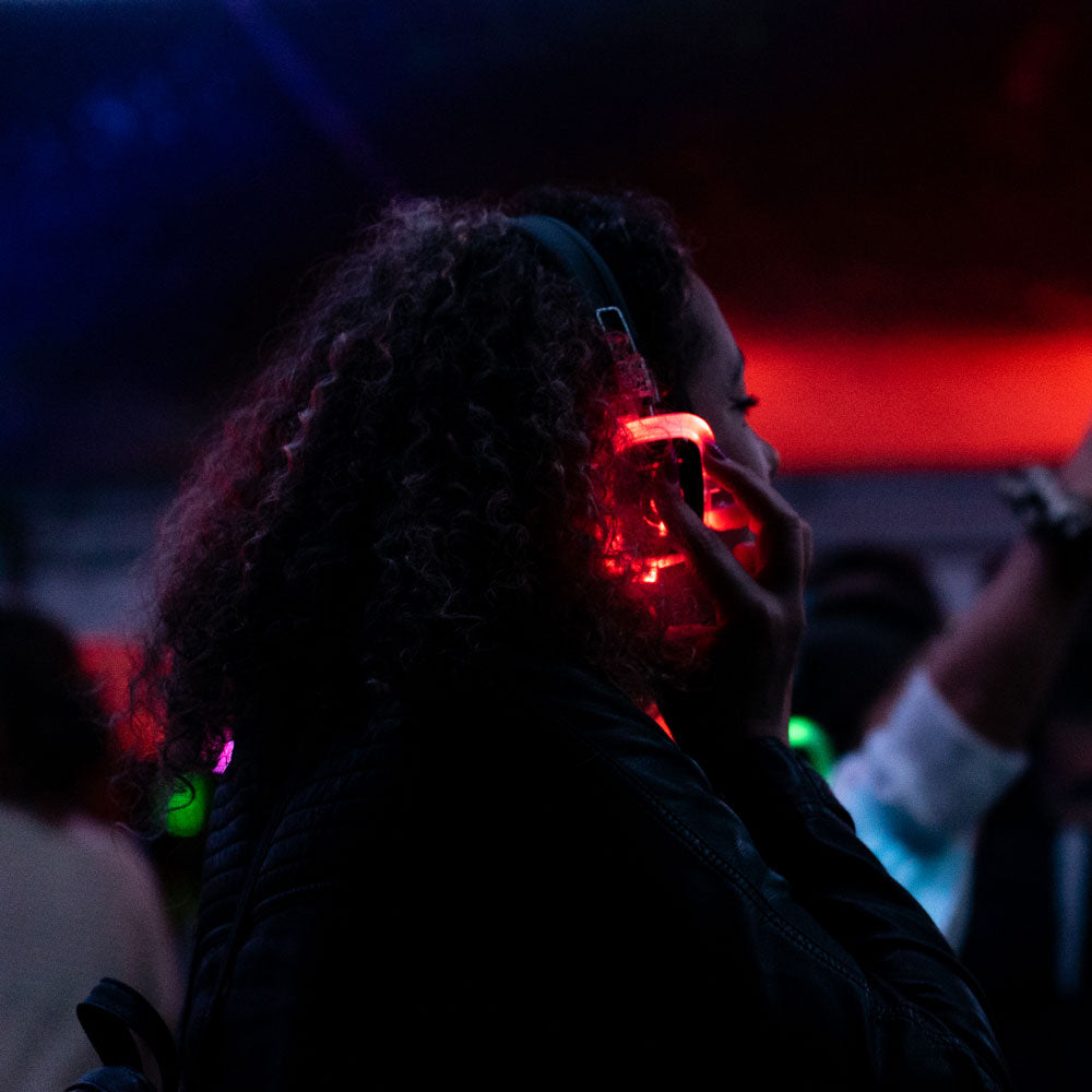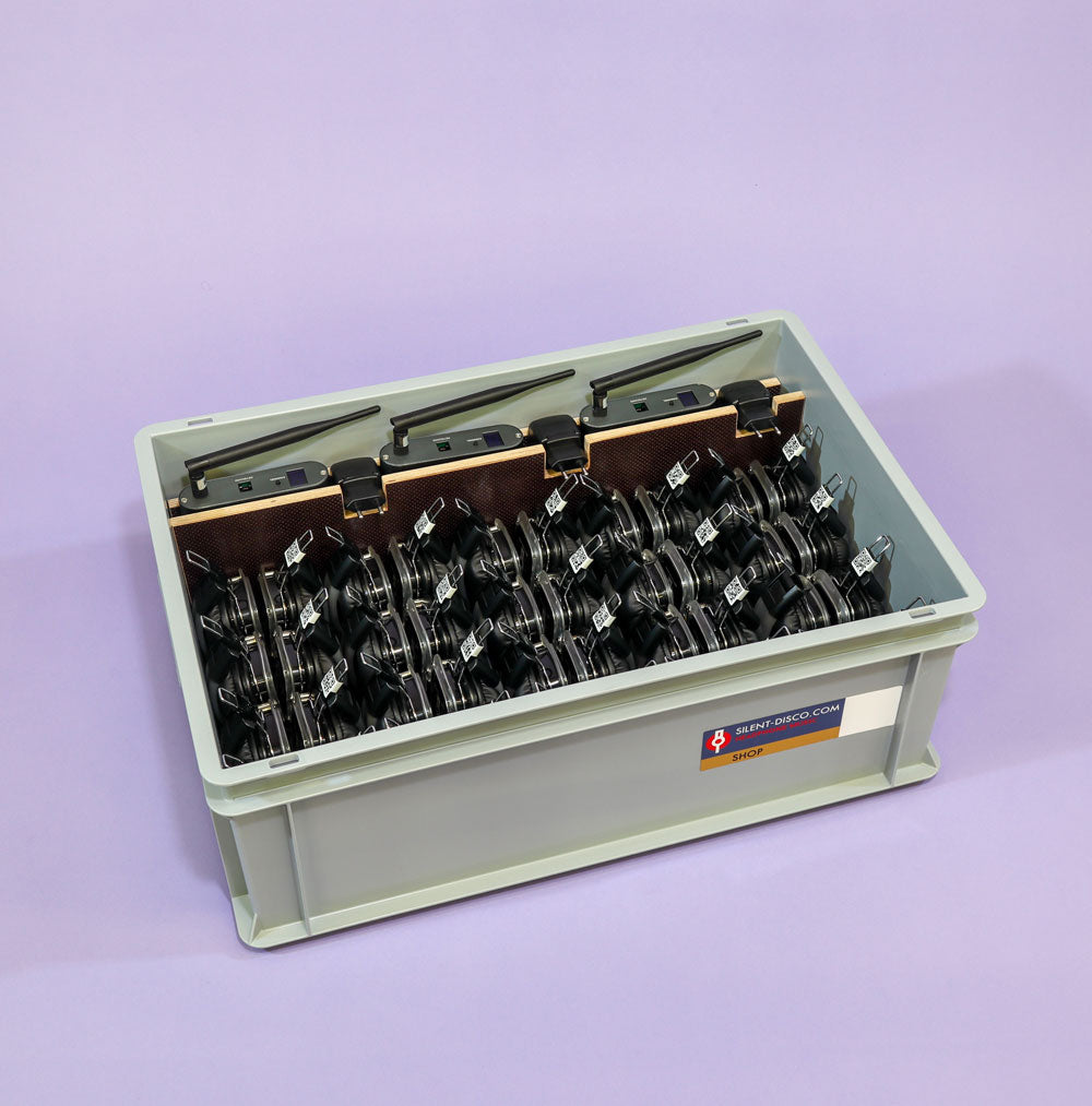 Die Kopfhörer sind für eine Dauer eines Abends (ca. 8 Stunden) aufgeladen.